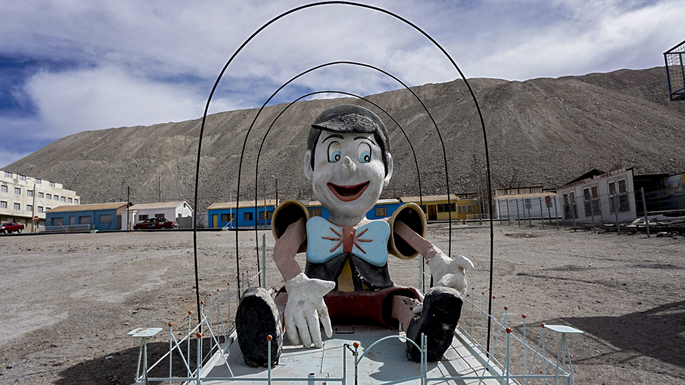 CHILE. – Hay un Pinocho más grande que un humano sentado en medio de la plaza de Chuquicamata, un pueblo minero donde hubo hasta 30 mil habitantes y ya no vive nadie. Sus habitantes se fueron por la contaminación.