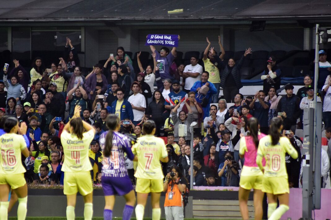 Dentro del estadio, las banderas feministas de la Barra ondeaban en la parte baja de la cabecera norte, el espacio que el club América destinó a este grupo de animación. El futbol sin violencia ganó terreno en una noche histórica. «¡Ahí están las de la Barra Feminista!», «se alcanza a ver el ‘si gana una, ganamos todas’», se escuchaba decir en las gradas, entre las más de 58 mil personas que acudieron a la cita entre Águilas y Tuzas para la gran final.