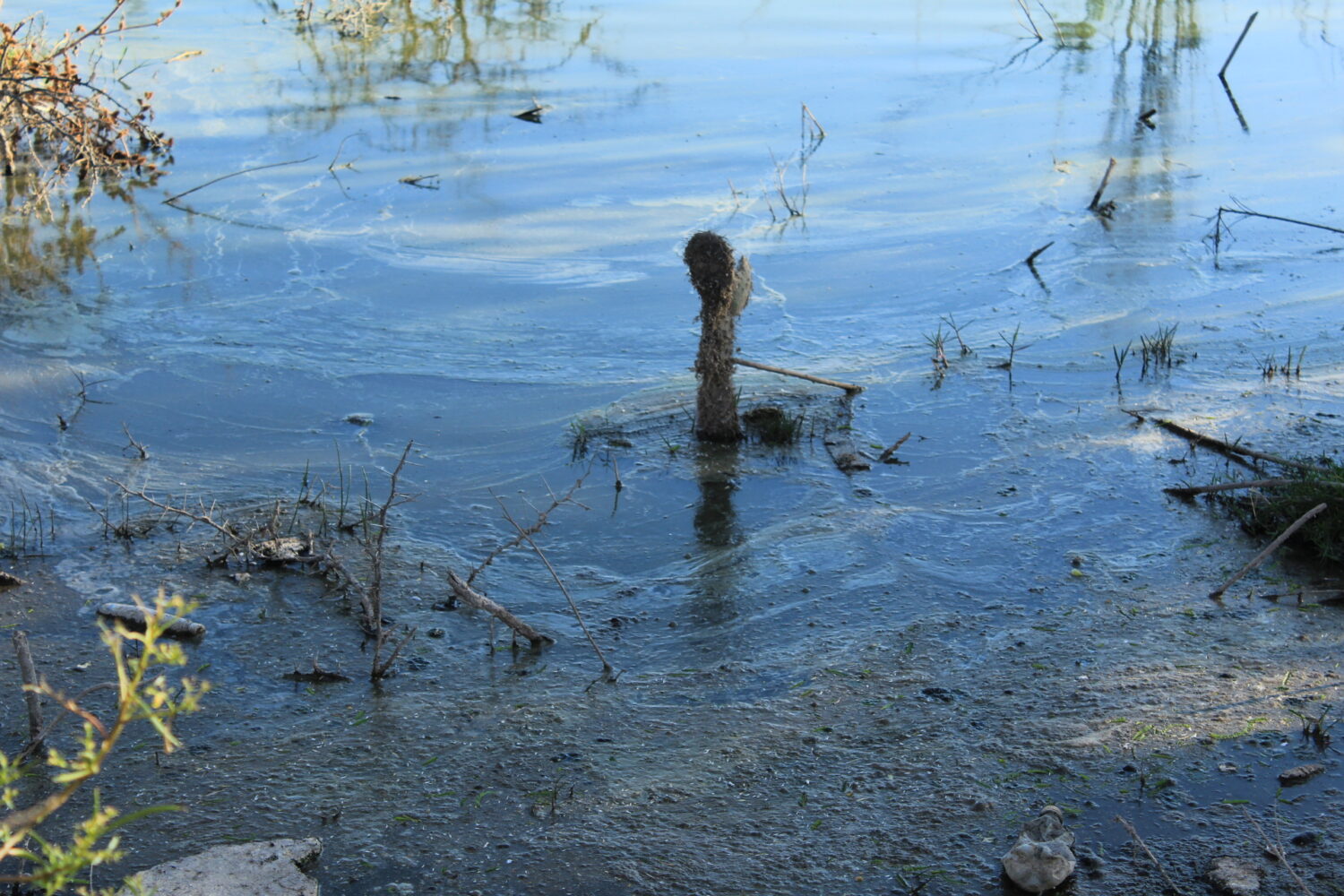 Los caminos de agua negra que llega al estanque de las mulas, donde antes solían jugar las y los niños. Fotografía Georgina Macías.