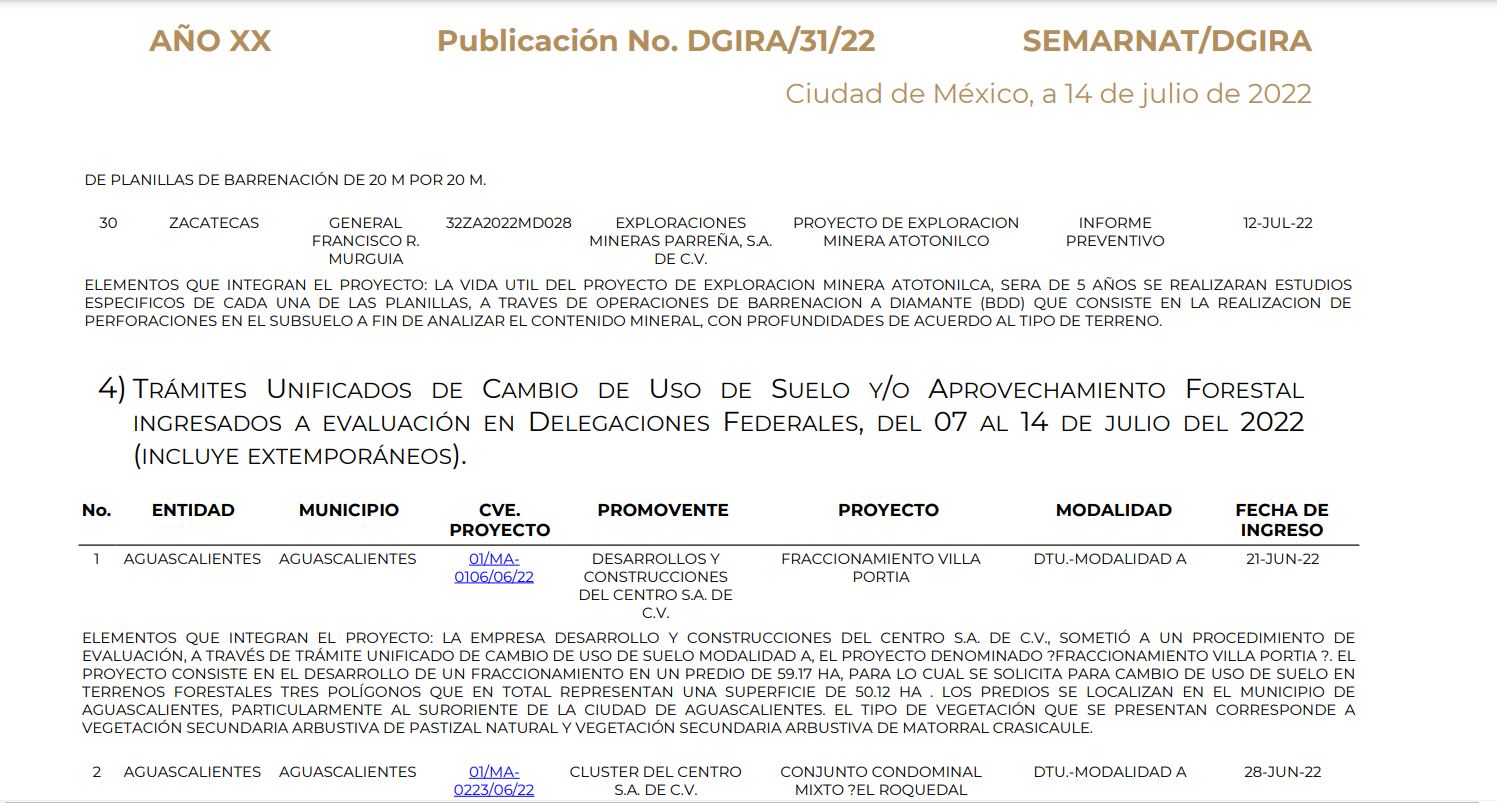 Documento de la solicitud de cambio de uso de suelo para la construcción del  Fracc. Villa Portia perteneciente a Grupo San Cristobal. Captura tomada de la  Gaceta oficial de la Secretaría de Medio Ambiente y Recursos Naturales.