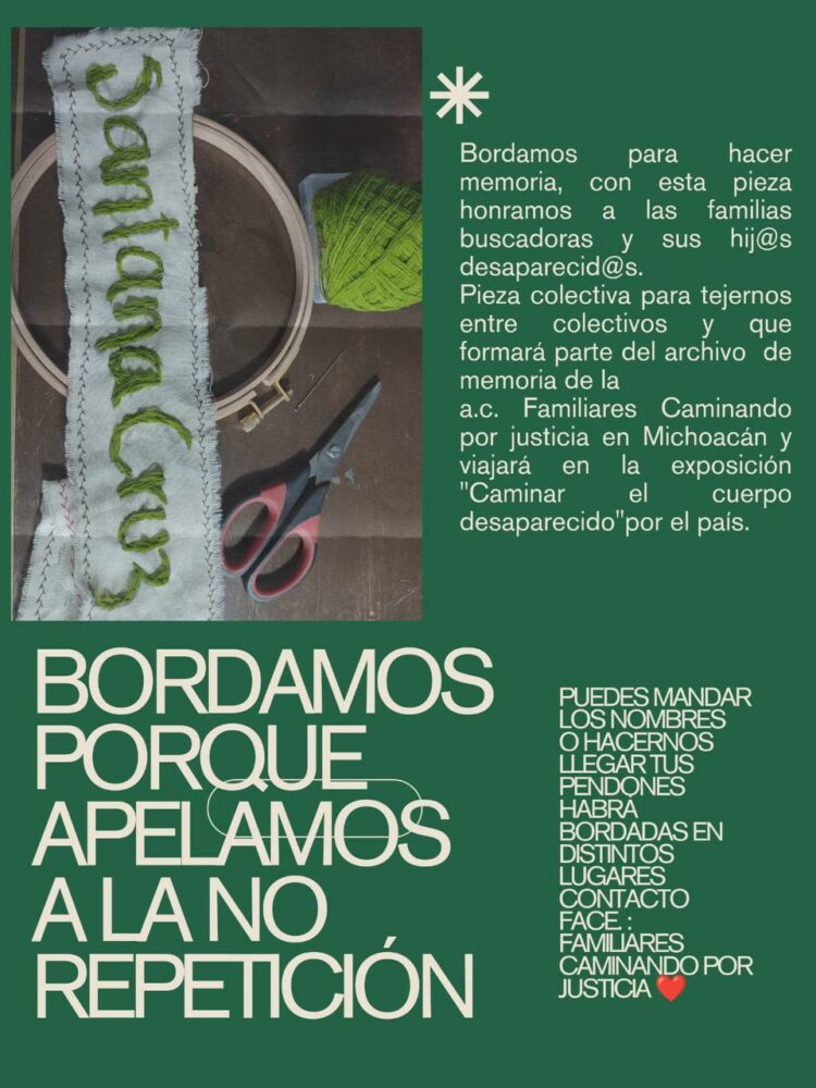 Las y los integrantes del colectivo convocan a todos los familiares – ya sea que forman parte de un colectivo o familiares que buscan de manera independiente – a que les manden las listas de las personas a quienes buscan y sus nombres. O pueden realizar el bordado y enviárselos.