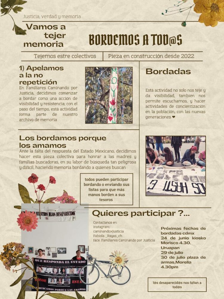El colectivo “Familiares Caminando por Justicia” convoca a familias buscadoras, colectivos de personas buscadoras y asociaciones civiles a ser parte de los bordados del árbol de la memoria, la cual es una pieza colectiva para honrar a quienes buscan y a sus “tesoros”.