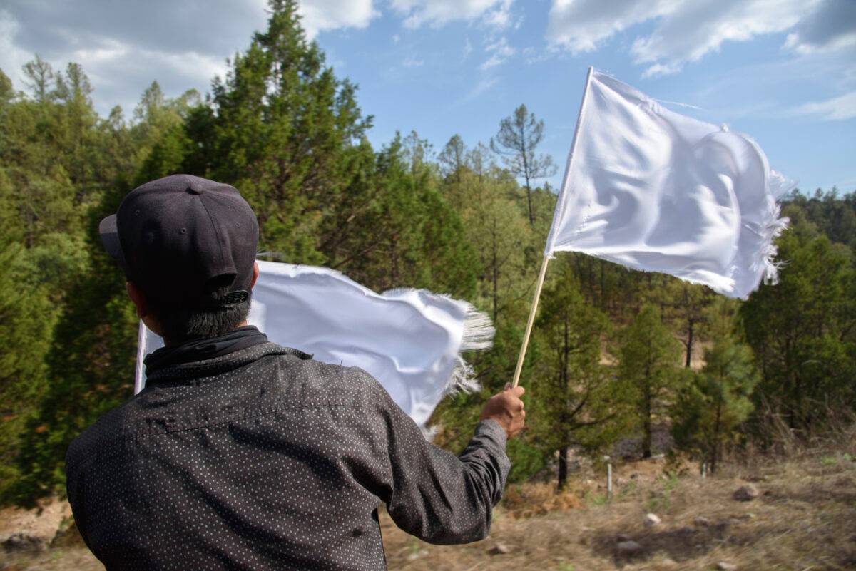 Un joven rarámuri sostiene dos banderas blancas en señal de paz.