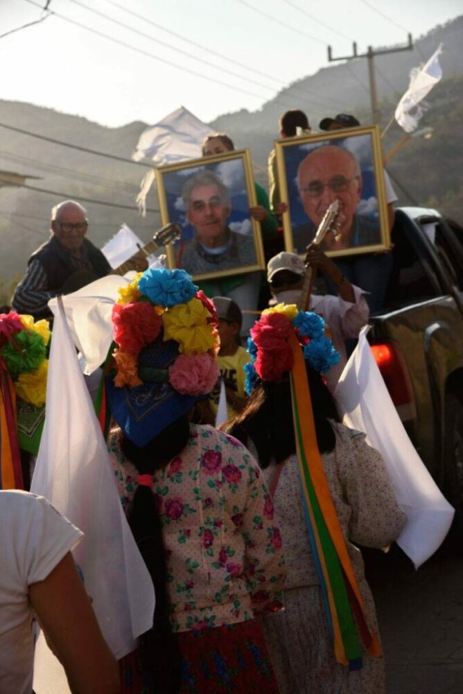 Montados en decenas de camionetas y con las fotografías del padre Gallo y Mora, la caravana recorrió más de ochenta kilómetros desde el lugar donde fueron encontrados los cuerpos de ambos jesuitas, así como del guía de turistas, Pedro Eliodoro Palma Gutiérrez, hasta la iglesia en la que José Noriel Portillo, alias “El Chueco”, les arrebató la vida.