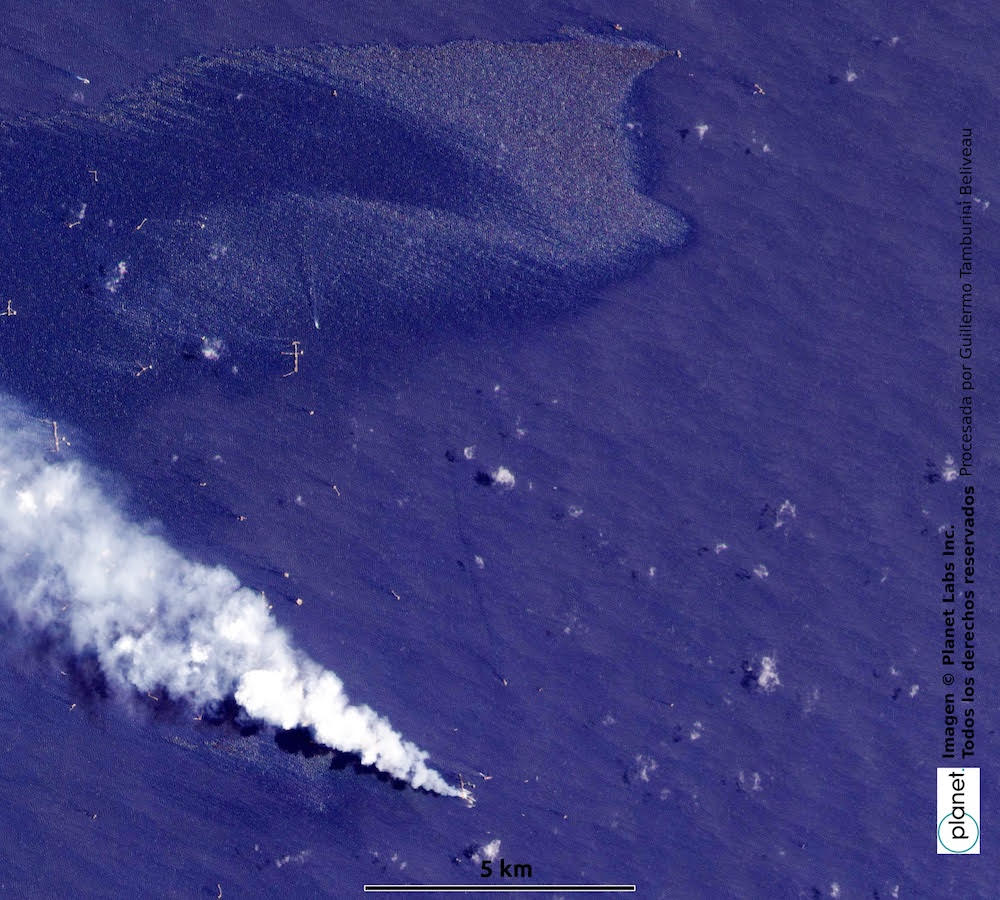 El geógrafo Guillermo Tamburini apuntó en una conferencia de prensa que existen imágenes satelitales que señalan un derrame de al menos mil metros cúbicos de vertido, el cual habría iniciado entre el 3 y 4 de julio.