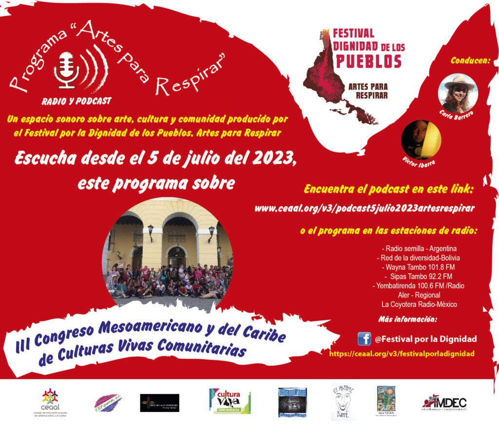 El podcast “Artes para Respirar” es un espacio sonoro sobre arte, cultura y comunidad producido por el Festival por la Dignidad de los Pueblos. Artes para Respirar; en esta hablamos sobre el III Congreso Mesoamericano y del Caribe de Culturas Vivas Comunitarias, que se llevó a cabo en Matanzas, Cuba, del 28 de junio al 4 de julio.