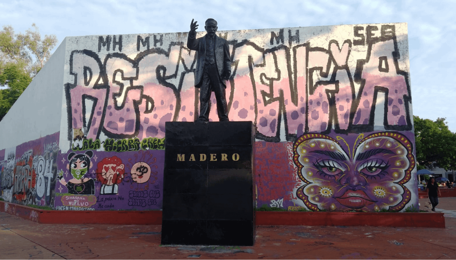 Ahí, llaman la atención los grandes murales que se colocaron en las instalaciones externas del tren ligero: en grandes letras, Francisco I. Madero contrasta con el mensaje “Resistencia”, que se encuentra a sus espaldas e interrumpe de golpe el enmarque de la estatua, que originalmente tiene como límite el mismísimo firmamento. En la otra sección, el mural “El levantamiento de las mariposas”, de Proyecto Rojo, se erige como una dignificación de la lucha feminista contra la violencia feminicida.