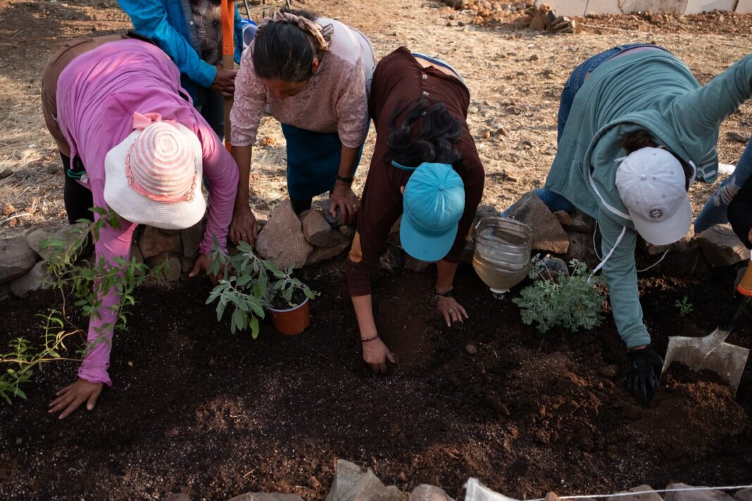 Un grupo de mujeres y niñas están paradas en círculo. La consigna es pasarse energía a través de las manos que no se tocan.Tienen los ojos cerrados y cada una debe imaginarse a sí misma como parte del huerto que están gestando. Algunas dijeron que eran el agua. Hubo quien dijo ser el tinaco, porque en un huerto es importante tener agua acumulada y contenida para el riego. Gregoria De Jesús Díaz, una mujer bajita, de sonrisa cálida, dijo que ella se imaginaba siendo la tierra porque “sobre ella estamos”, aunque está desnutrida, al igual que sus cuerpos. A esto, Flor López Sánchez, agrónoma de la Escuelita Benita Galeana, respondió que, al igual que a sus cuerpos, la tierra se puede nutrir y por eso están allí.