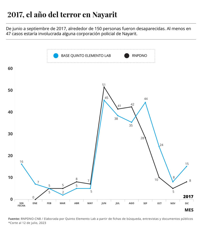 En sólo cuatro meses, más de 150 personas fueron desaparecidas en Nayarit. Eso ocurrió en 2017. Al menos en 47 de esos casos, las evidencias indican que los responsables eran servidores públicos que operaban desde la fiscalía o alguna policía del estado. Seis años después, esas desapariciones siguen impunes. Todo ello en medio de un conflicto entre la fiscalía estatal y la Fiscalía General de la República