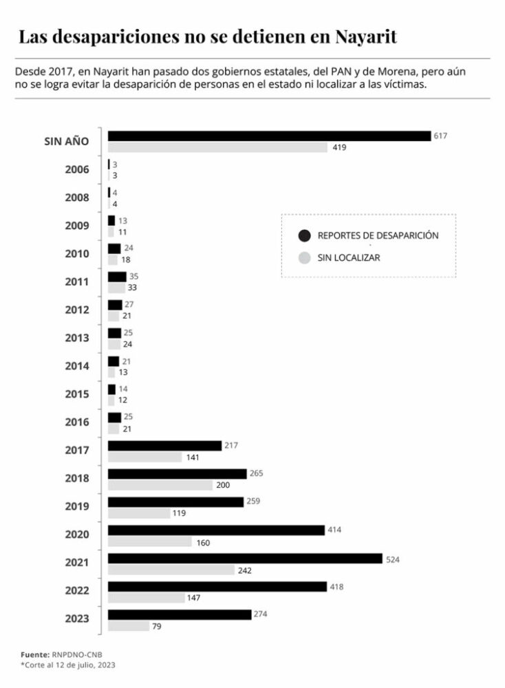 Seis años después de que Nayarit sufrió varios episodios de desapariciones masivas y forzadas, las investigaciones no avanzan a nivel estatal, pero tampoco en el ámbito federal. Las mismas familias han identificado que algunos de los presuntos perpetradores continúan trabajando para la Fiscalía General del Estado y para otras policías en la entidad.