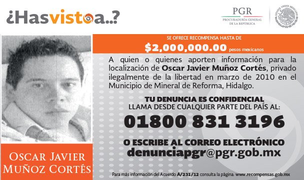 El 28 de noviembre de 2008, Óscar Javier, estudiante de gastronomía de 21 años, salió con unos amigos a un bar de Pachuca; alrededor de la medianoche, dos patrullas cerraron el paso a su vehículo. Los agentes dijeron que habían recibido el reporte de que estaban tomando en la calle. Un policía municipal entregó al joven a un grupo criminal. Desde entonces no se sabe de su paradero.