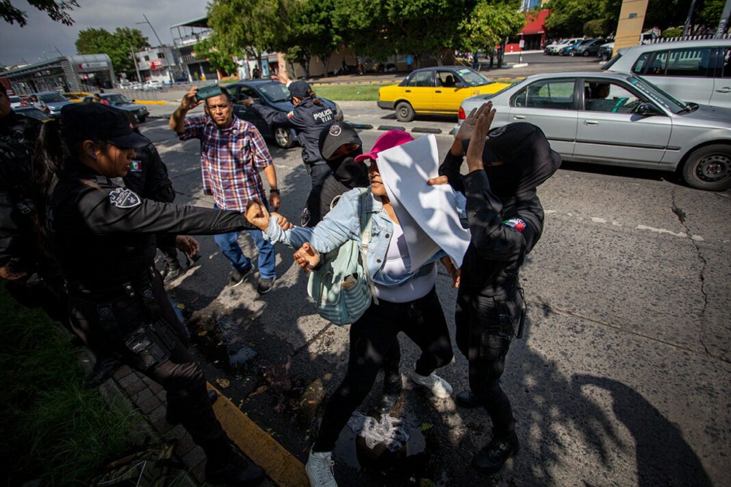 Más de 20 policías estatales desalojaron a una madre buscadora que protestaba a las afueras de la Fiscalía Especial en Personas Desaparecidas de Jalisco por la desaparición de su hija, Mayra Alejandra Mendoza.