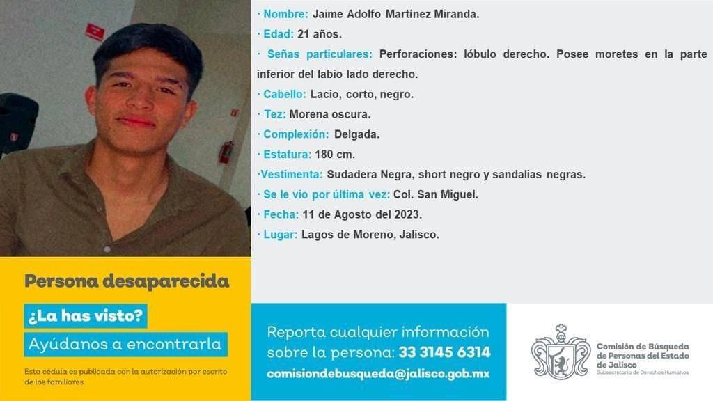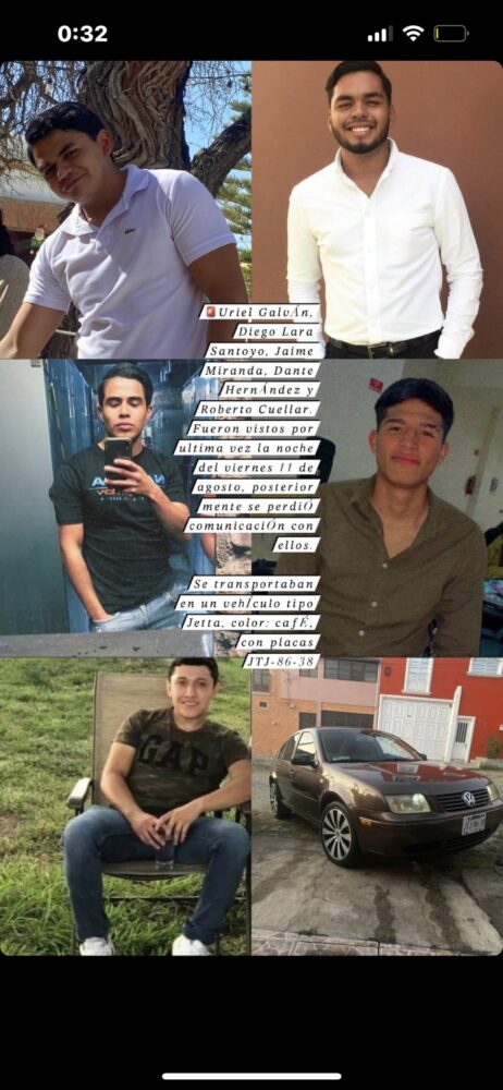 Cinco jóvenes originarios de Lagos de Moreno, Jalisco fueron desaparecidos el pasado viernes 11 de agosto: Roberto Olmeda Cuellar, Diego Alberto Lara Santoyo, Uriel Galván González, Jaime Adolfo Martínez Miranda y Dante Hernández.