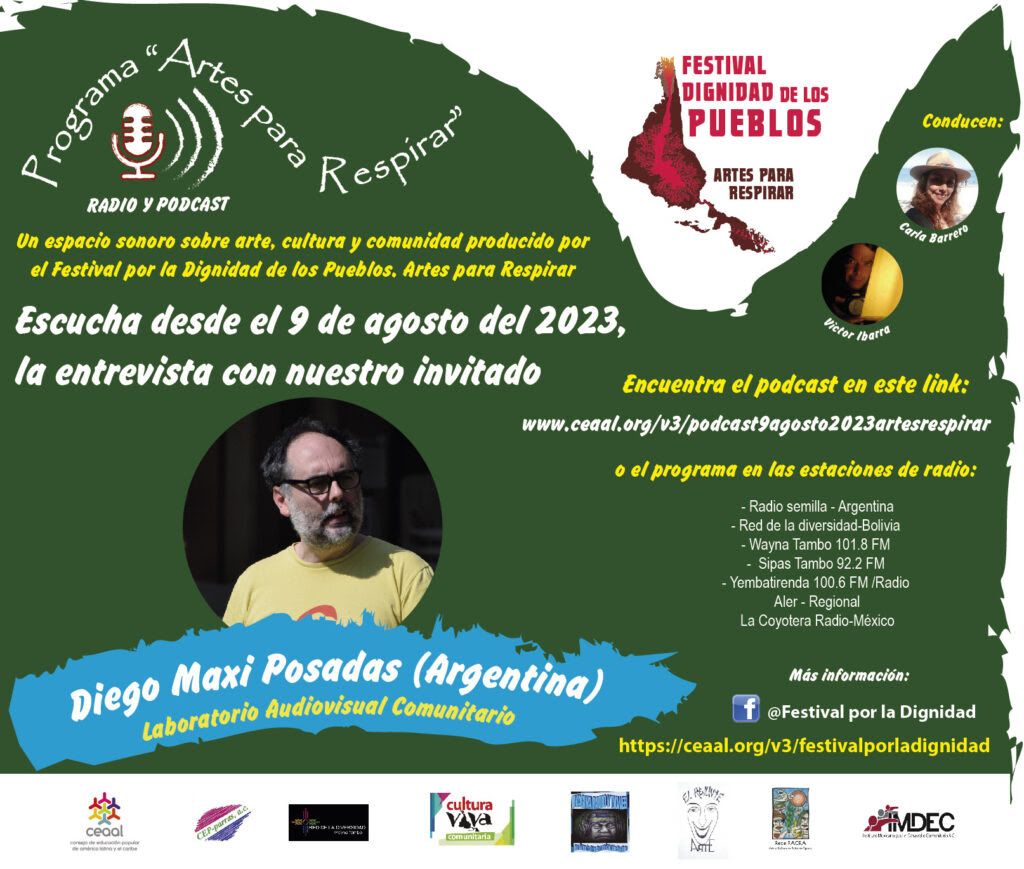 El podcast “Artes para Respirar” es un espacio sonoro sobre arte, cultura y comunidad producido por el Festival por la Dignidad de los Pueblos. Artes para Respirar; en esta ocasión entrevistamos entrevistamos a Diego Maxi Posadas (Argentina), del Laboratorio Audiovisual Comunitario, donde nos habla sobre su ser y quehacer como colectivo creativo comunitario en Buenos Aires, Argentina.
