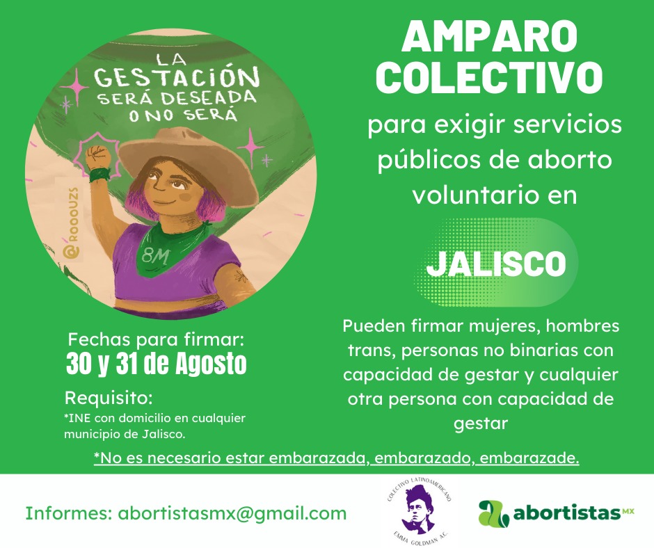 La organización AbortistasMx convoca a mujeres, personas con capacidad de gestar, como: hombres trans y personas no binarias a firmar un amparo para que en Jalisco los servicios de salud garanticen el aborto voluntario sin importar la despenalización del aborto dentro del Código Penal del Estado. Este 30 y 31 de agosto estarán en Guadalajara para recabar las firmas que serán entregadas ante un juez o jueza federal.
