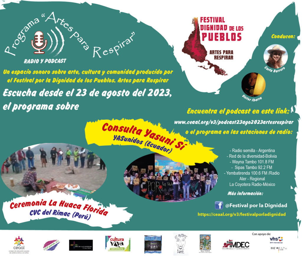 El podcast “Artes para Respirar” es un espacio sonoro sobre arte, cultura y comunidad producido por el Festival por la Dignidad de los Pueblos. Artes para Respirar; en esta emisión, conducida por Carla Barrero (Bolivia), se habla sobre la Ceremonia La Huaca Florida, con CVC del Rimac en Perú, y sobre el triunfo histórico en la consulta Yasuní Sí para detener una explotación petrolera en la Amazonía, con YASunidos, en Ecuador.