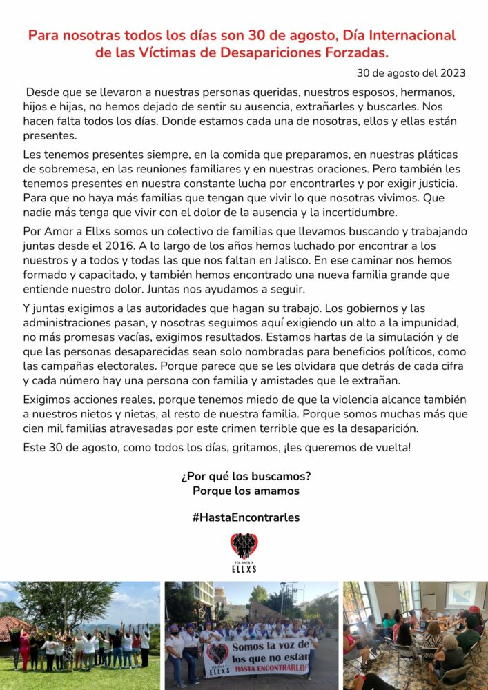 “Desde que se llevaron a nuestras personas queridas, nuestros esposos, hermanos, hijos e hijas, no hemos dejado de sentir su ausencia, extrañarles y buscarles. Nos hacen falta todos los días. Donde estamos cada una de nosotras, ellos y ellas están presentes” expresaron las familias que integran el colectivo Por Amor a Ellxs en Jalisco, a través de un comunicado este 30 de agosto, Día Internacional de las Víctimas de Desaparición Forzada.