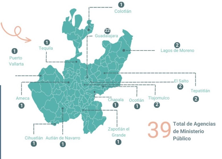 La Fiscalía Especial de Personas Desaparecidas cuenta con 39 Agencias del Ministerio Público en Jalisco: 22 se encuentran en la sede central de Guadalajara, 2 en Tlajomulco de Zúñiga y 15 están distribuidas en los 11 distritos judiciales en los que opera regionalmente la Fiscalía del Estado.