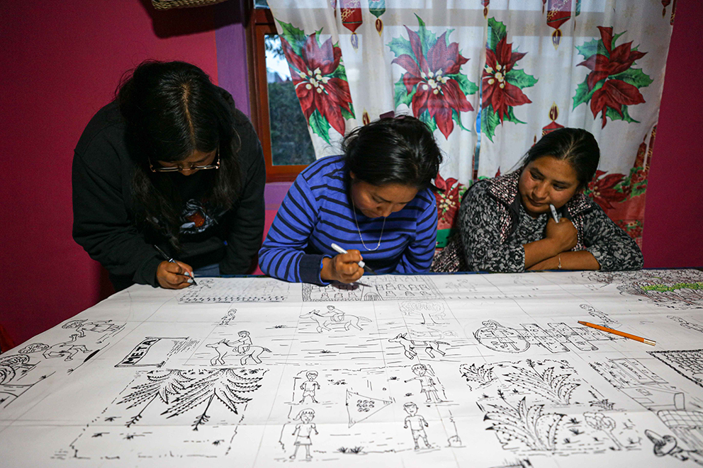 “Los jóvenes de los pueblos indígenas compartimos nuestro arte para reforzar el conocimiento de nuestra propia cultura y territorios”, describe Frida durante uno de los talleres del CICC. Ve el arte como frutos del esfuerzo de muchos años de cuidar la tierra, desde sus abuelas y antes. Es cuidar también de la memoria de sus abuelas.