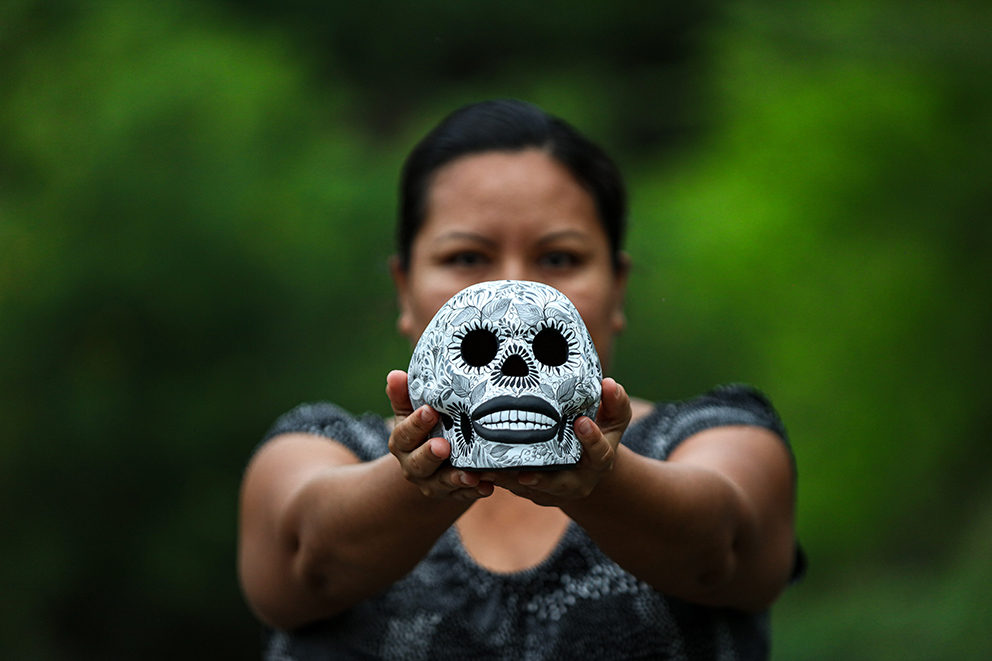 Estos cráneos de barro cuentan la historia de su pueblo nahua, heredero de los tlacuilos, narran el día de muertos, la siembra, cómo son las bodas o los juegos tradicionales de las infancias. Con trazos magistrales, las pinceladas delimitan aves que sobrevuelan el cielo de este territorio, también las flores, árboles o serpientes que aquí habitan.
