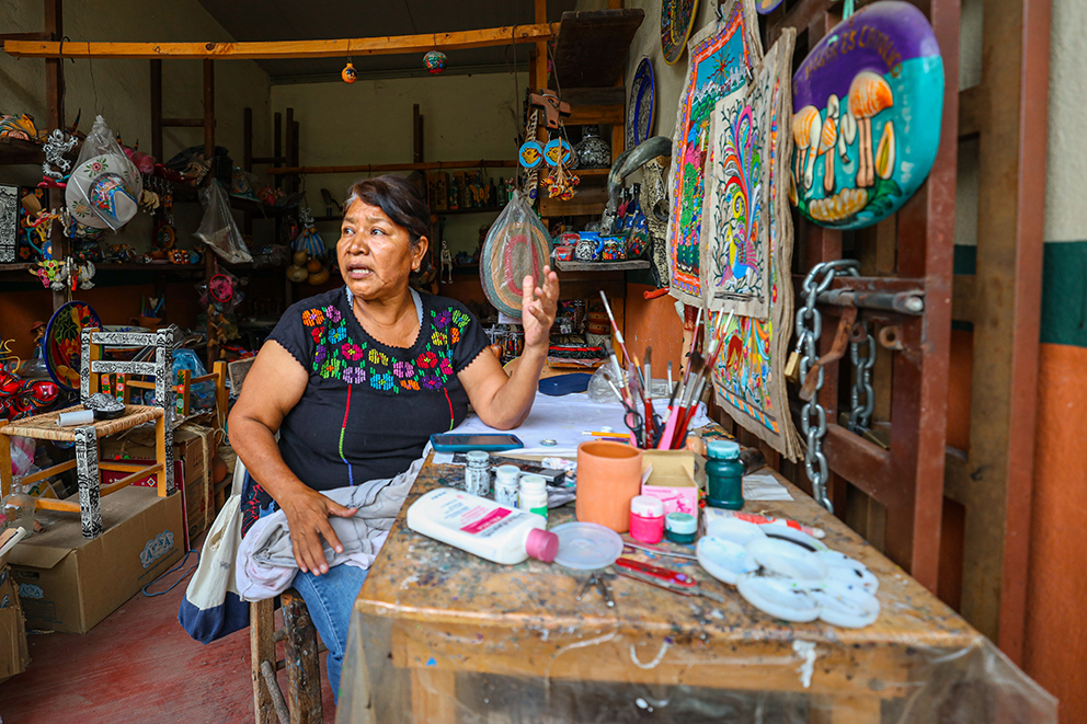 “Hacer la cooperativa me ha servido de mucho, porque tiene mucho valor lo que pinto, y no lo sabía, es algo que tiene mucho valor para mí y para nuestro pueblo. Yo empecé a pintar a los 7 años, a colorear primero. Nos enseñaron a pintar la historia, se hacen primero florecitas, hojitas, cosas de la naturaleza. ”, describe Lucía Ascencio, habitante de Xalitla e integrante de la cooperativa.