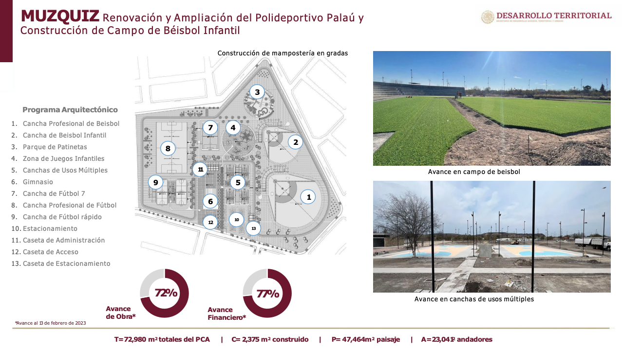 Sobre otras medidas del Plan Integral de Reparación y Justicia en Pasta de Conchos como la indemnización el gobierno ha reportado tres obras en los municipios de Múzquiz y San Juan Sabinas. La primera es la renovación y ampliación del Polideportivo Palaú y la construcción de un campo de béisbol infantil; la renovación de la Plaza Central de Nueva Rosita; y la renovación de un módulo deportivo en la localidad.