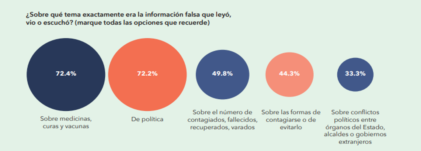 Otro hallazgo importante fue que son personas jóvenes y adultas mayores las más proclives a ser víctimas de bulos noticiosos. Además, que la mayoría de las notas que la gente percibe como falsas son aquellas de tipo político (siete de cada diez); y que cuando incluso se trata de otro tipo de contenido (de salud, como en la pandemia; o de seguridad pública, por ejemplo), siempre hay un componente político importante en la confección de las noticias, pues se trata de temas de país que los gobernantes consideran claves para convencer a votantes de que son funcionarios eficientes. Es decir, política y desinformación son percibidas como dos palabras que suelen ir juntas.