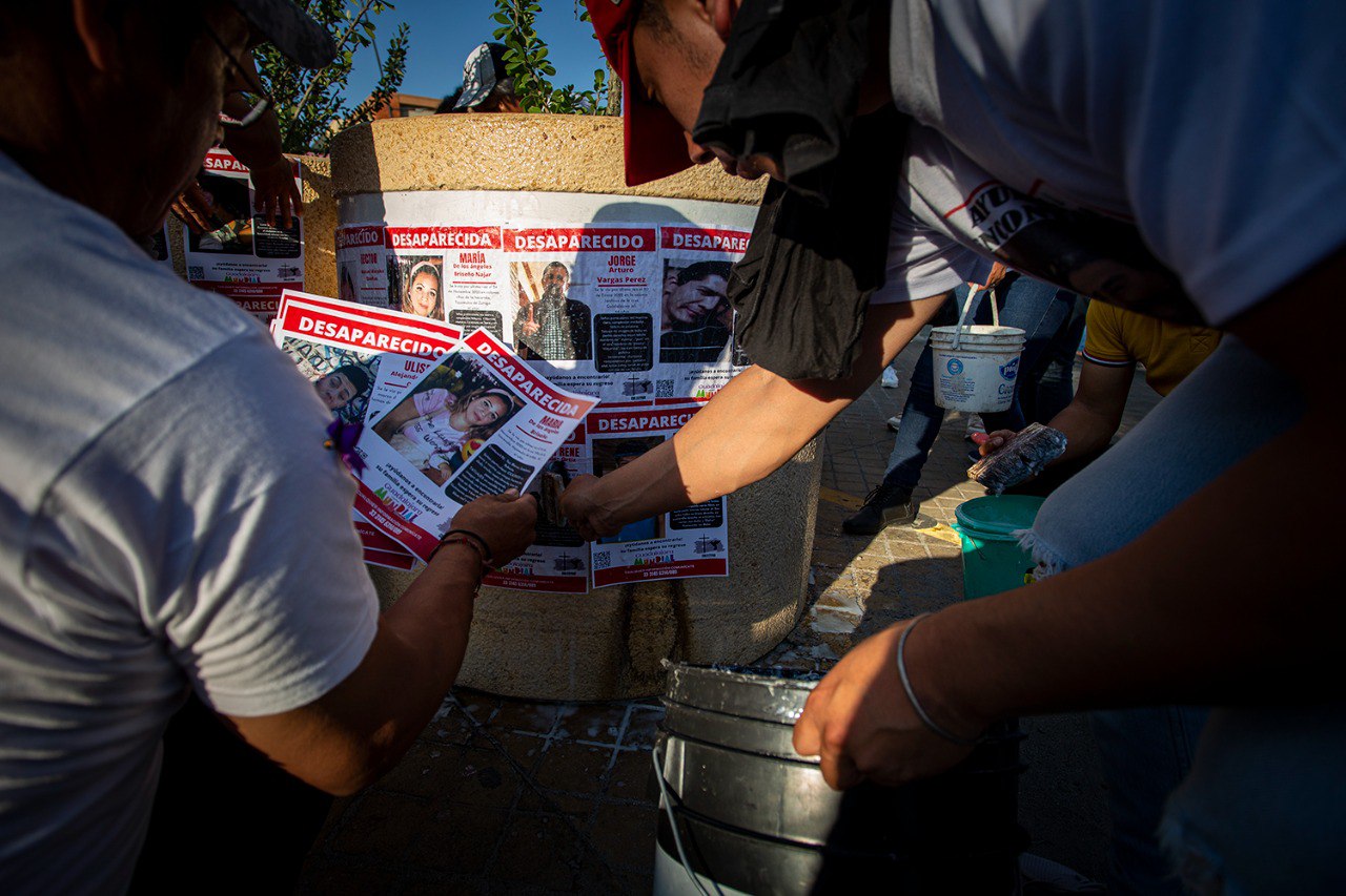 Frente a esta situación, las y los integrantes del colectivo decidieron pegar en las vallas de metal, en las macetas del andador de la avenida 16 de septiembre y en los espectaculares las fichas de búsqueda de sus seres queridos. Las lonas de sus familiares las colocaron en el piso para que quien pasara se detuviera a ver a sus “tesoros”, con la esperanza de obtener alguna información de su paradero.