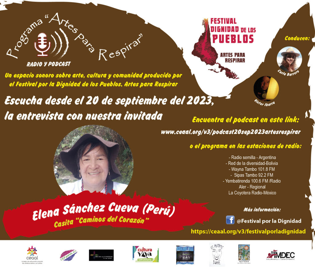 El podcast “Artes para Respirar” es un espacio sonoro sobre arte, cultura y comunidad producido por el Festival por la Dignidad de los Pueblos. Artes para Respirar; en esta emisión conducida por Carla Barrero (Bolivia) y Víctor Ibarra (México) se entrevistó con Elena Sánchez Cueva (Perú), de Casita “Caminos del Corazón”, donde habla sobre este espacio cultural y comunitario, en Cajamarca, Perú.