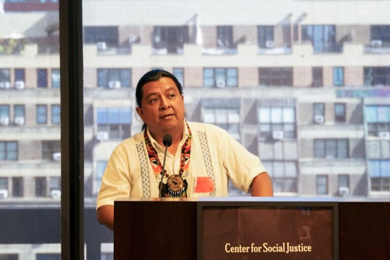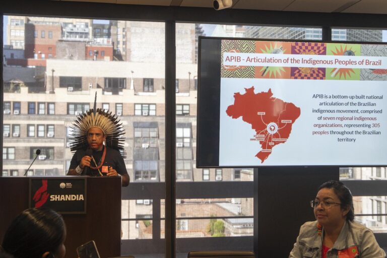 —Hemos llegado acá a Nueva York para tener reuniones, presentaciones, diálogos y pedir colaboración, pedir auxilio, porque no podemos hacerlo solos, tenemos que coordinar, colaborar. La colaboración es importante. Yo actúo desde mis bosques y territorio y otra persona puede actuar desde otros ecosistemas o desde las mismas zonas urbanas. La concientización no se hace sola, es un trabajo recíproco.