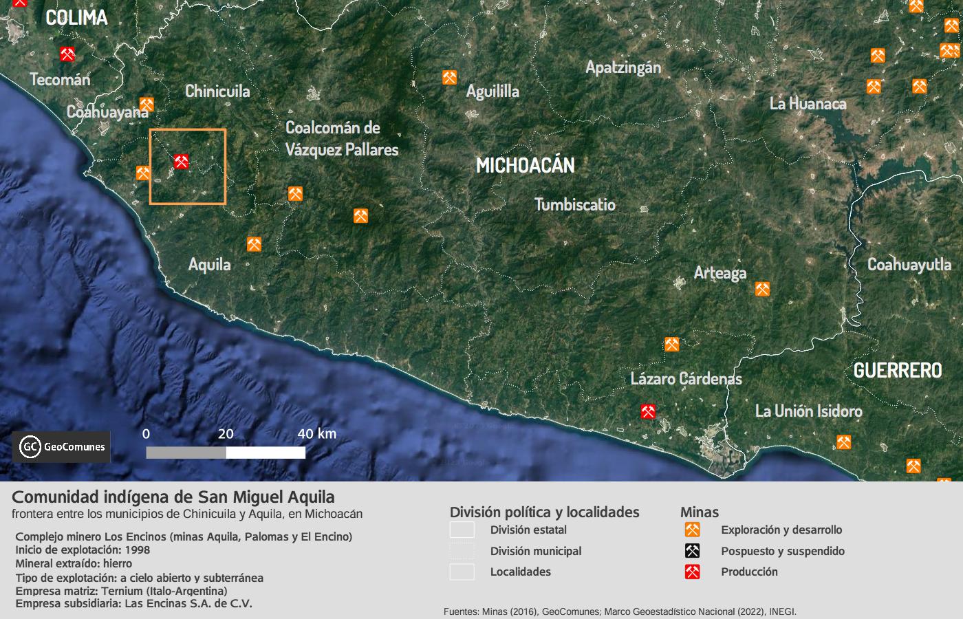 * En ese territorio indígena, la empresa Ternium —una de las principales productoras de acero en Latinoamérica— opera el complejo minero Los Encinos. Con la llegada de la minería, los cerros comenzaron a ser cercenados, el río Aquila dejó de tener langostinos y la comunidad se dividió. En esa región, además, hace tiempo que los grupos del narcotráfico dejaron de disimular su presencia.