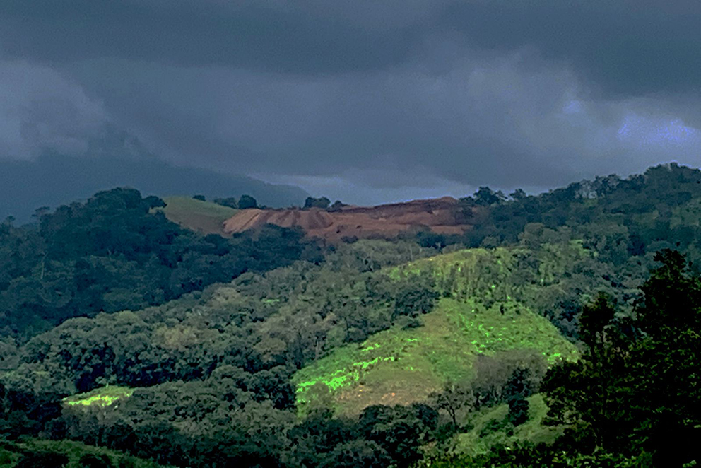 En el camino Ramal Cerro de Los Juanes, que conduce a unas oficinas del consorcio minero, y a Las Astillas, un pueblo casi vacío a consecuencia del desplazamiento forzado, hay un punto que funciona como mirador. Desde ahí, en medio de la brecha sin cobertura telefónica, se alcanza a ver el Cerro Los Juanes cercenado por la actividad minera.