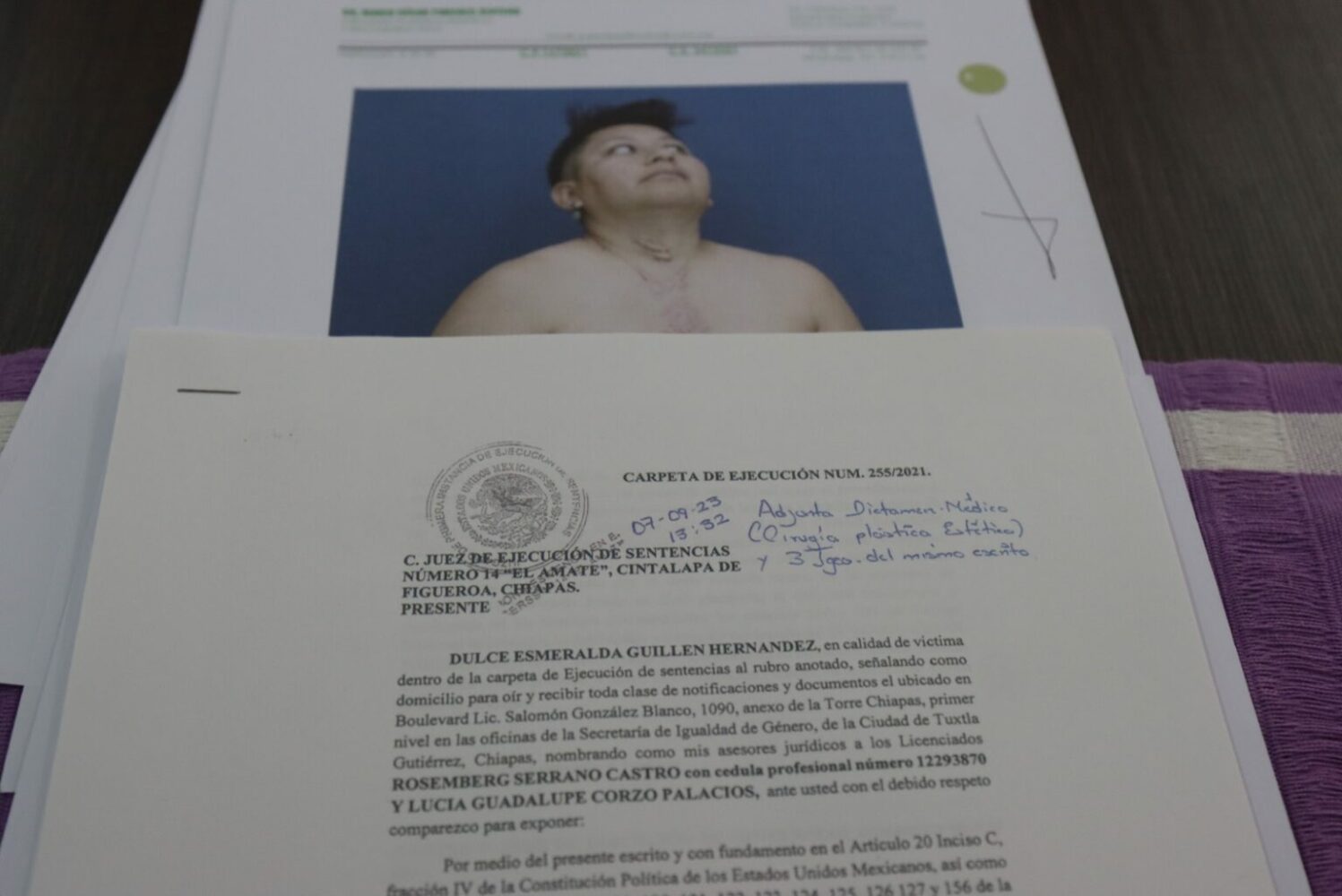Dulce Esmeralda, policía municipal de Tuxtla Gutiérrez, durante sus labores de protección y asistencia a la ciudadanía fue agredida por dos de sus compañeros de la institución. Le rosearon alcohol y prendieron fuego. Hoy sus agresores se encuentran libres, tras pagar apenas una pena de siete meses de prisión y una multa de tres mil pesos.