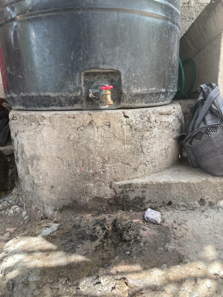 El tinaco, tiene una llave de agua en su base y puedo observar a una madre lavándole las manos a su hija. Debajo del agua enjabonada que escurre, coloca un plato sucio, el cual termina de lavar cuando su hija se va de nuevo a jugar.