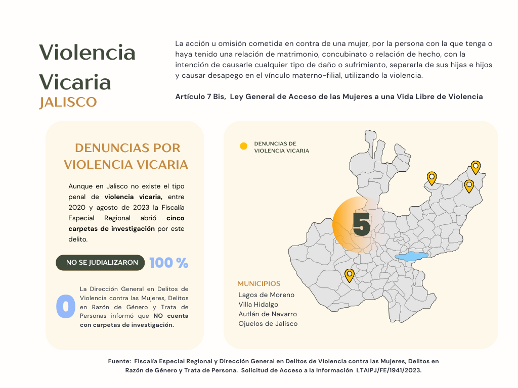 En Jalisco, aunque no existe el tipo penal de violencia vicaria, entre 2020 y agosto de 2023 se han abierto cinco carpetas de investigación por este delito, de acuerdo con la solicitud de acceso a la información LTAIPJ/FE/1941/2023. Según informó la Fiscalía Especial Regional, las denuncias fueron presentadas en Villa Hidalgo, Autlán de Navarro, Ojuelos de Jalisco y Lagos de Moreno. Ninguna de estas ha sido judicializada.