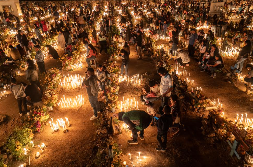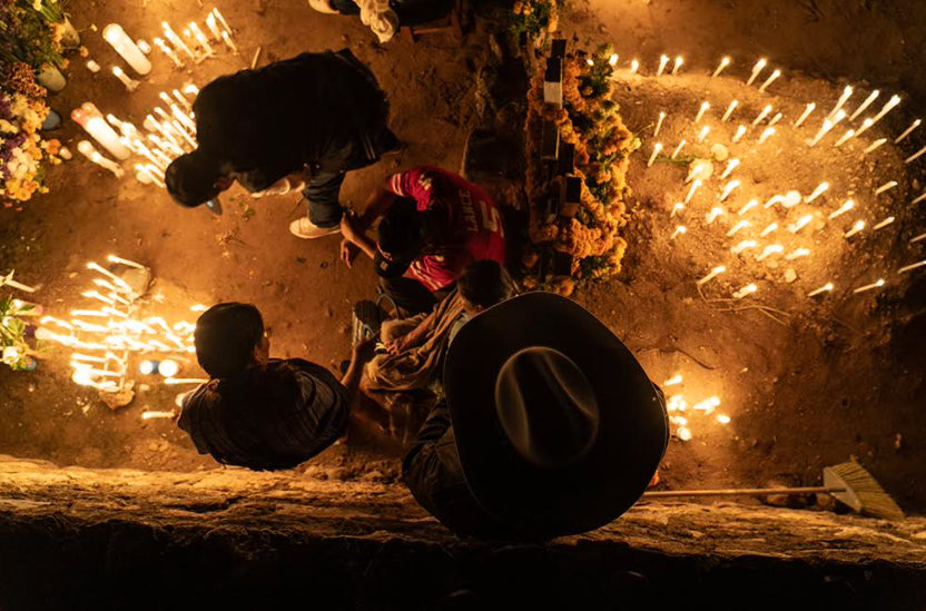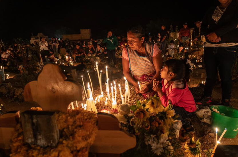 Con el tono amarillo de las flores de cempasúchil y la luz cálida de las cándelas, el panteón queda completamente iluminado.