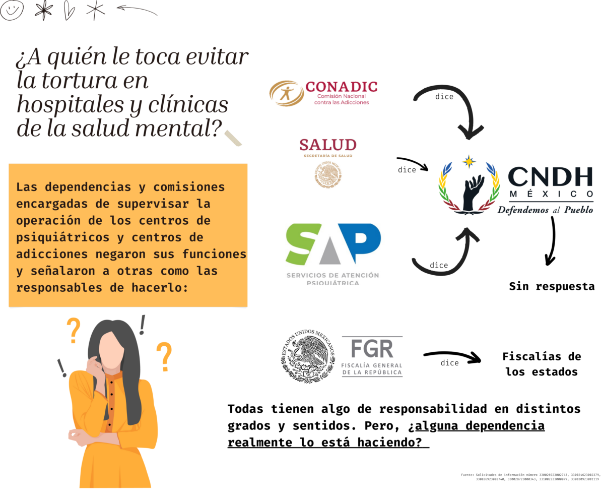 En la NOM 028 se facultaba a la Comisión Nacional contra las Adicciones (CONADIC) para ser quien regule y supervise los centros de internamiento por uso de sustancias, pero la respuesta a la solicitud de información 331002223000079 señaló que eso no era de su competencia. Una respuesta similar dio la Secretaría de Salud en la respuesta a la solicitud 330026923002743.