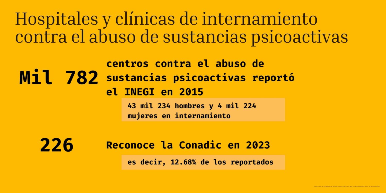 En 2020 en México había 2 mil 219 establecimientos residenciales privados de atención a adicciones (donde reciben también a personas con otro tipo de trastornos mentales) según el Informe sobre la situación de la salud mental y el consumo de sustancias psicoactivas en México 2021. Pero para 2023, la Secretaría de Salud reconoce solo 34, es decir tan solo el 1.5% de los reportados.