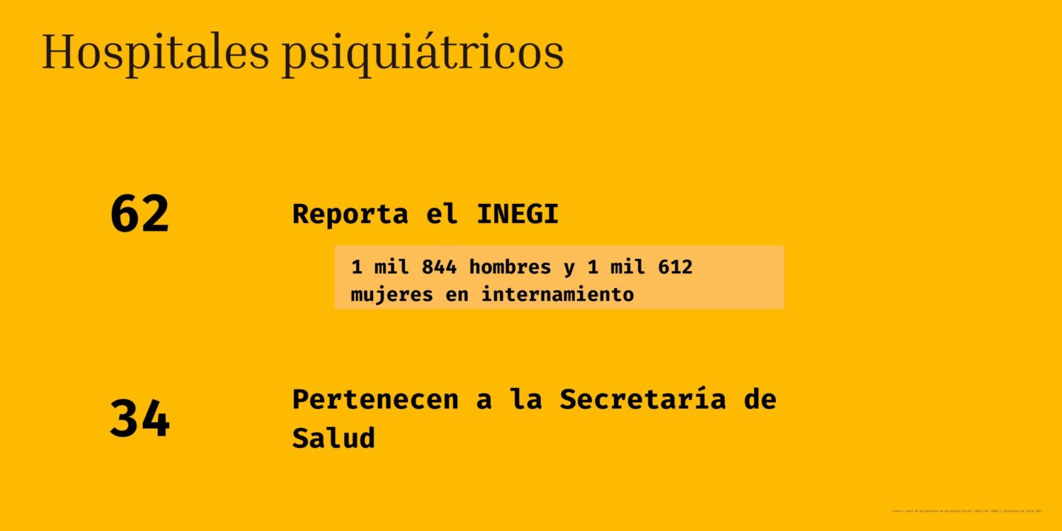 En México, existen 34 hospitales psiquiátricos operados por los servicios de salud estatales lo que resulta insuficiente para la atención de las personas que requieren de los servicios, señala el Segundo Diagnóstico Operativo de Salud Mental y Adicciones realizado en 2020.