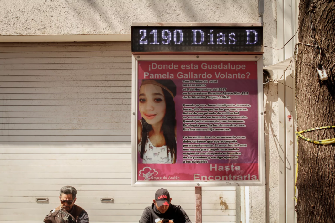 —Agarra bien al güero no se te vaya a caer —le dice María del Carmen, la madre de Pamela, a su hijo mayor Esteban, quien sostiene con su mano izquierda el banco sobre el que su hermano José intenta colgar una lona en la que se lee “Guadalupe Pamela Gallardo Volante ¡Seguimos buscándote hasta encontrarte!”. Los carros que pasan a ambos lados del camellón de la avenida Dr. Río De La Loza en la colonia Doctores hacen que José se tambalee.