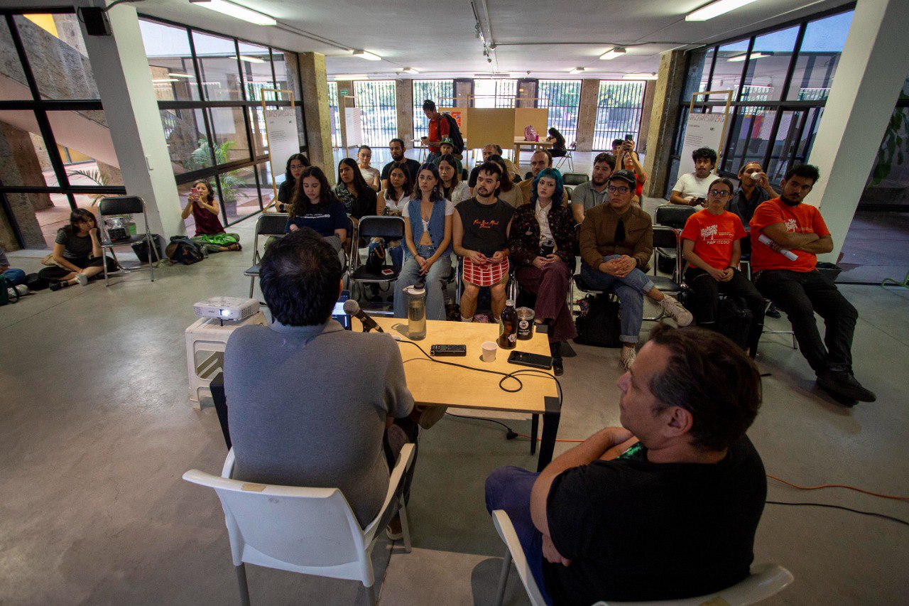 Durante el panel Christian Grimaldo explicó que la Psicogeografía estudia la influencia del entorno geográfico en las emociones y conductas de las personas. Así mismo abordó el concepto de “despojo urbano”, que se refiere a cómo en algunas zonas de las ciudades se desplaza a poblaciones vulnerables a través de procesos de gentrificación.