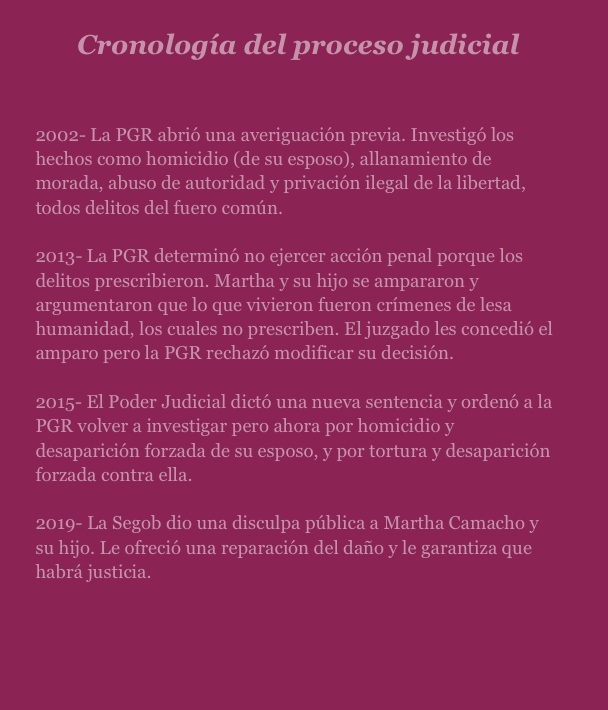 En esa época, el gobierno llamó a las víctimas de la Guerra Sucia a denunciar a los perpetradores. Confiada en la promesa de una transición política, Martha denunció, se hizo acompañar legalmente por el Centro de Derechos Humanos Miguel Agustín Pro Juárez (Centro ProDH) e inició un largo camino judicial que aún no termina.