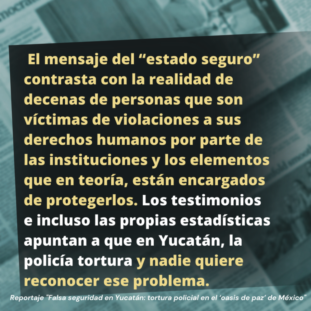 El mensaje del “estado seguro” contrasta con la realidad de decenas de personas que son víctimas de violaciones a sus derechos humanos por parte de las instituciones y los elementos que en teoría, están encargados de protegerlos. Los testimonios e incluso las propias estadísticas apuntan a que en Yucatán, la policía tortura y nadie quiere reconocer ese problema