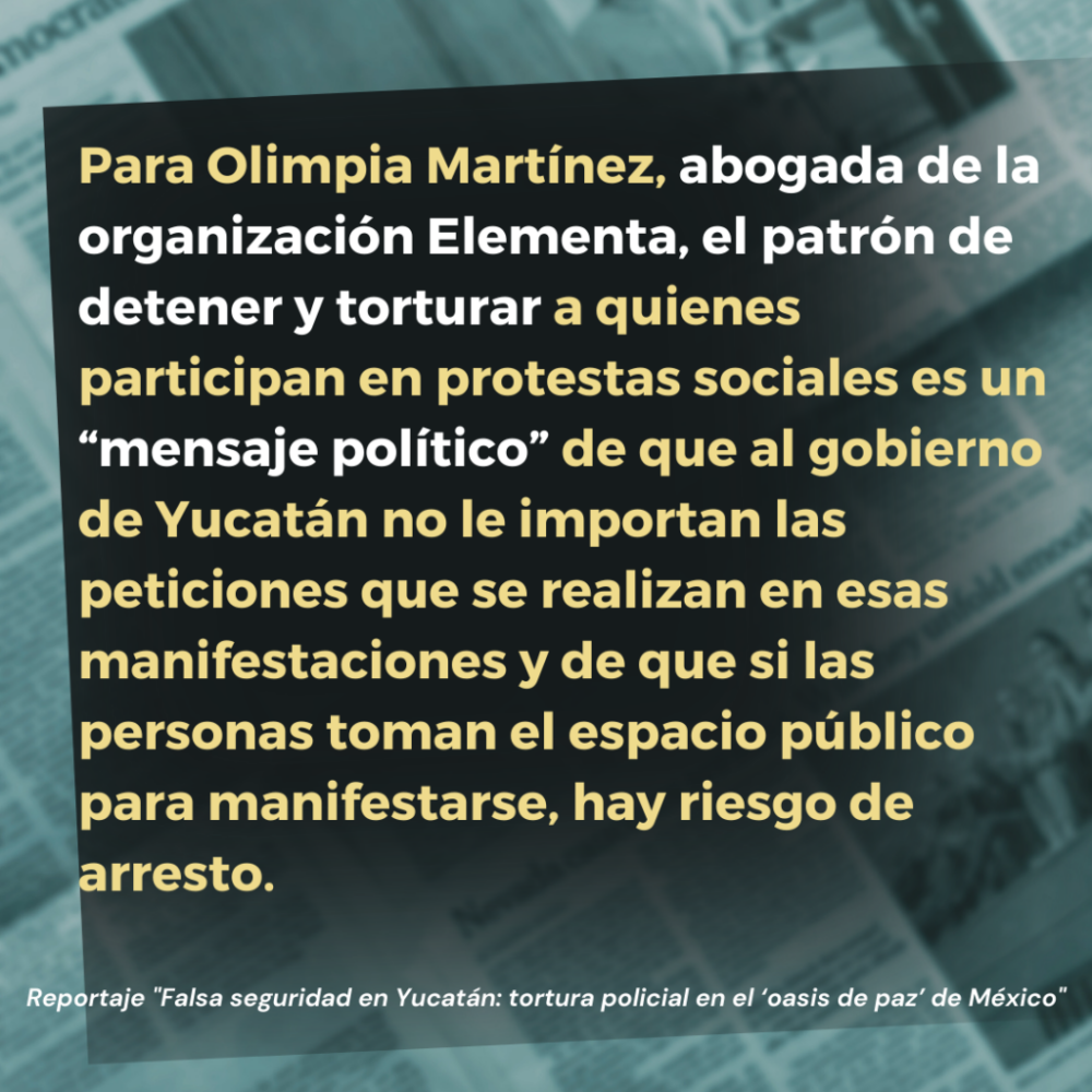 “No sabría decir si los policías no conocen cómo deben actuar, eso creo que corresponde a sus propias jefaturas señalarlo, pero es importante que en Yucatán se abra la conversación ,sobre cómo las corporaciones policiales y otros elementos de procuración de justicia están haciendo uso de detenciones arbitrarias y tortura para criminalizar a ciertas poblaciones específicas”, sostuvo Olivares.