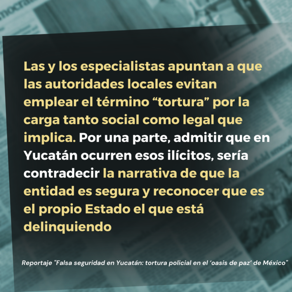 Las estadísticas no son el primer obstáculo para conocer la magnitud real del problema de tortura en Yucatán. El más importante es señalado por varios especialistas: en el estado ese delito no se nombra, lo cual equivale a ocultar, minimizar, subestimar o invisibilizar la violencia policial.