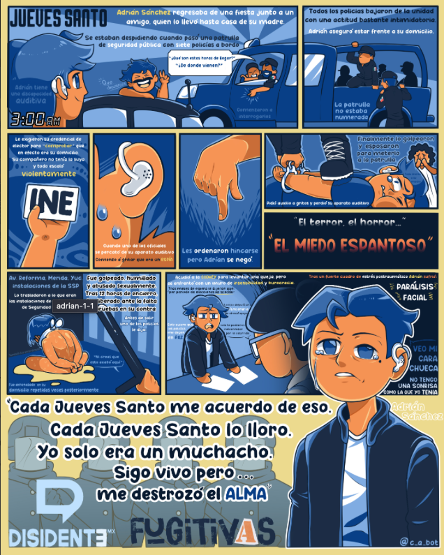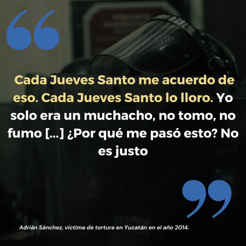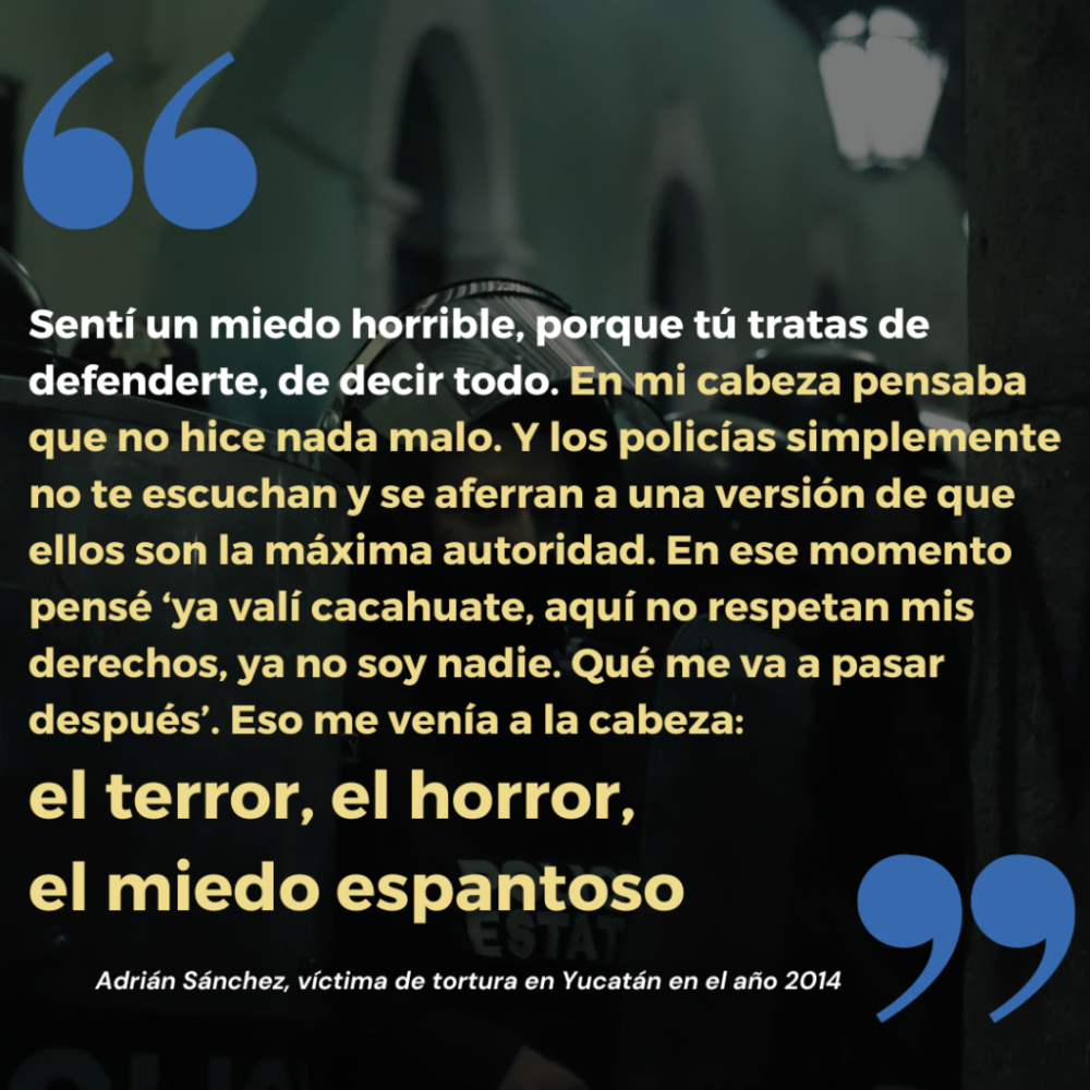 Adrián no suele hablar de los hechos que le trastocaron la vida, pero decidió hacer pública su historia porque a nueve años de lo sucedido no ha visto ningún cambio en el comportamiento de los policías en el estado, y le alarma la frecuencia con la que escucha casos de tortura y tratos o penas crueles, inhumanos y degradantes cometidos por los elementos de seguridad en Yucatán, “el estado más pacífico y seguro de México”.