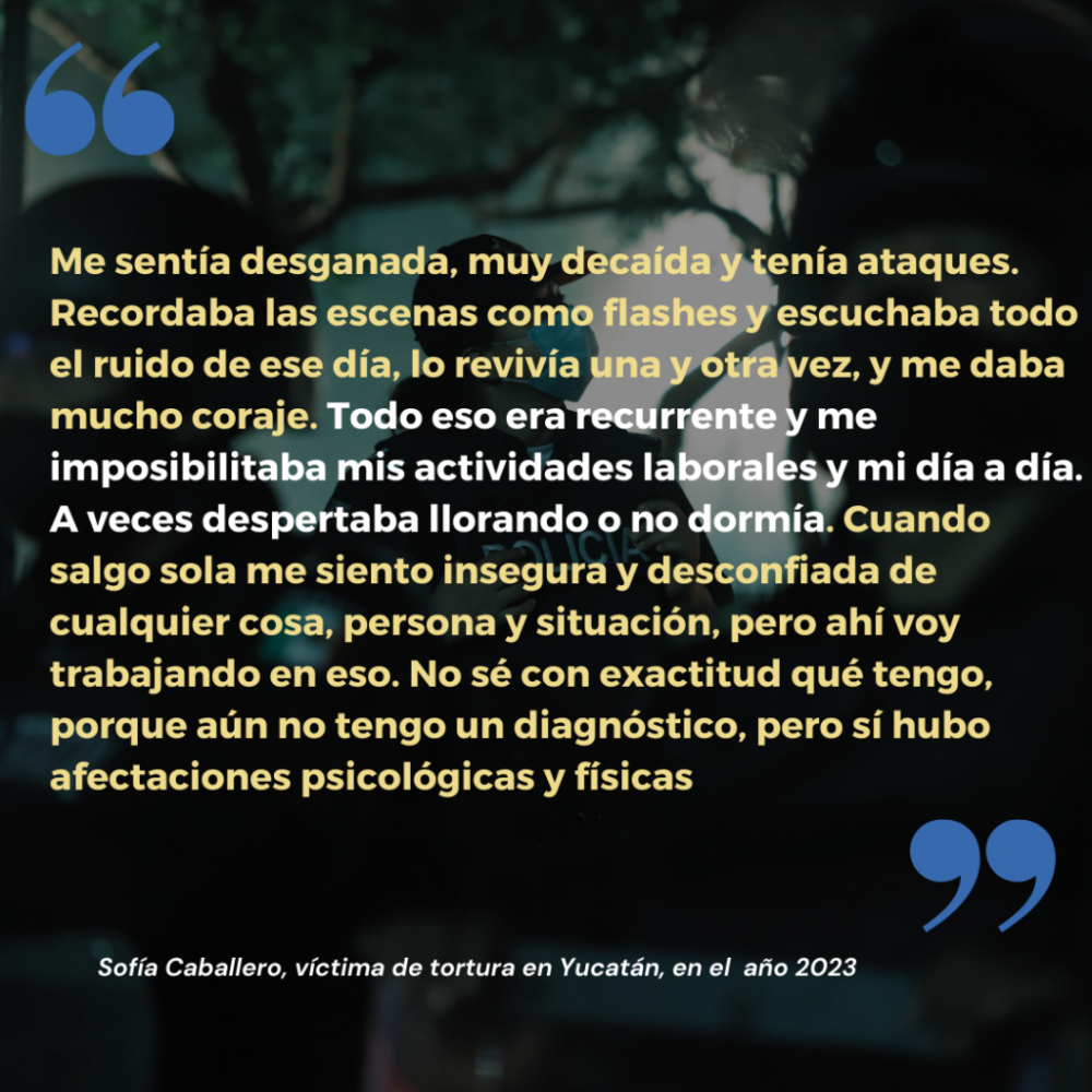 Las víctimas de tortura también suelen presentar afectaciones psicológicas, como el Trastorno de Estrés Postraumático (TEPT) u otros. Cuando recuperó su libertad, Sofía dejó de dormir, de salir a la calle y de trabajar, pues tenía delirios de persecución y paranoia.