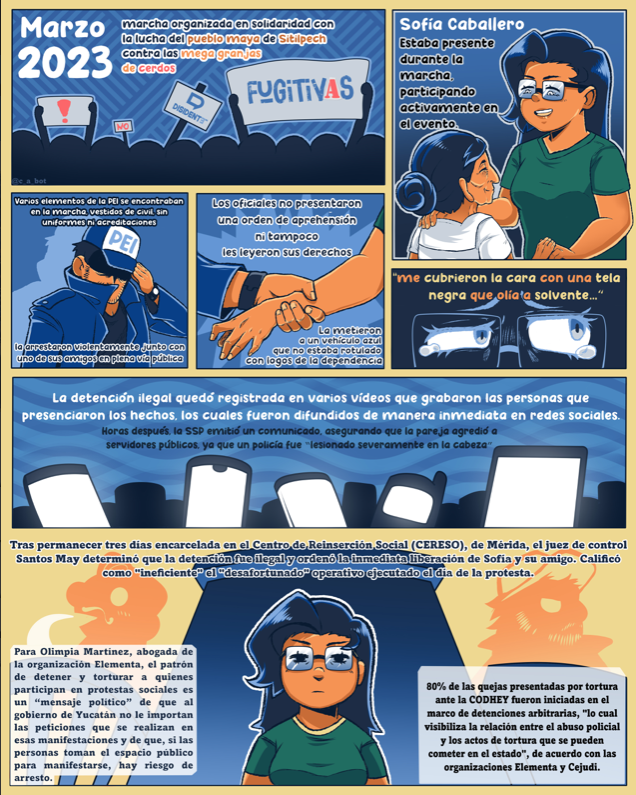 Sofía Caballero también fue detenida ilegalmente y torturada tras participar en una protesta en el 2023. Ella acudió el pasado mes de marzo a la marcha organizada en solidaridad con la lucha del pueblo maya de Sitilpech contra las megagranjas de cerdos.