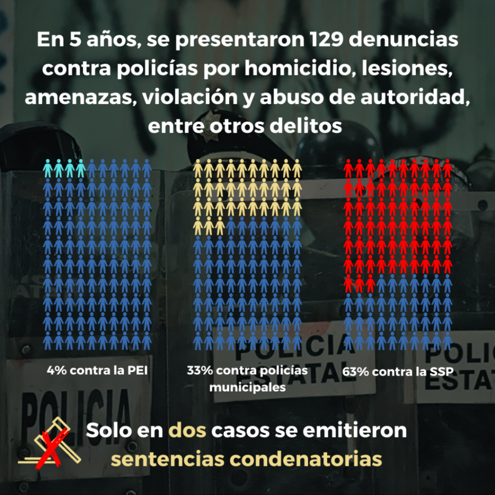 Sin embargo la FGE sí proporcionó información. Entre 2018 y 2023, fueron 41 las personas que denunciaron a policías: 23 por abuso de autoridad, 9 por violación, 5 por abuso sexual y 4 por hostigamiento sexual. Además, dos personas fueron asesinadas por agentes. En general, tenían entre 3 y 58 años. Salvo por el caso del homicidio de José Luis, se desconoce si a las demás personas se les brindó alguna indemnización o se les garantizaron medidas de no repetición.