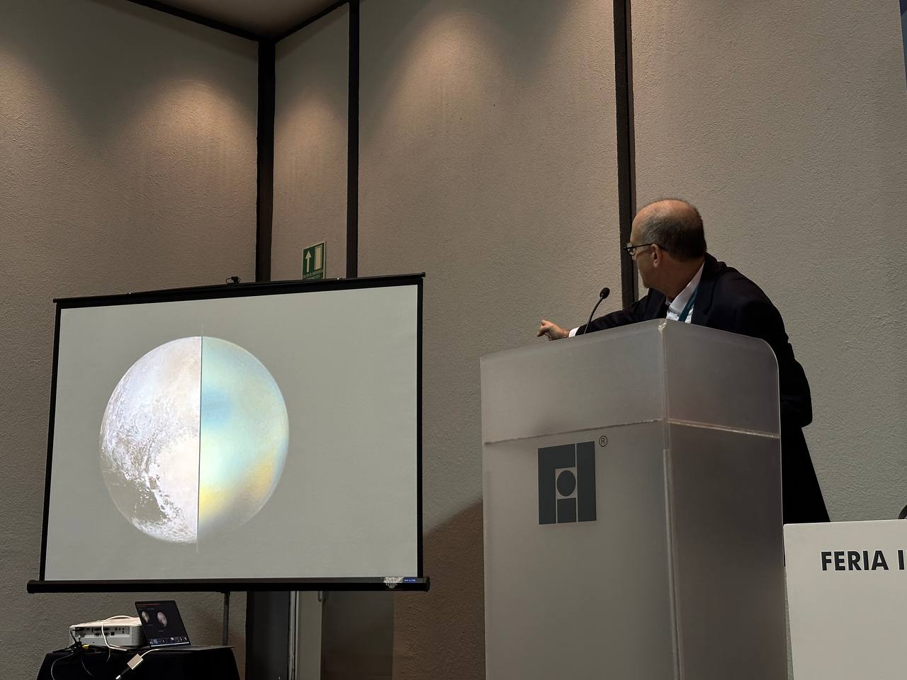 “Lo primero que vimos fue el cráter de corazón que se formaba en una de las caras del cuerpo celeste” expresó Grinson mientras mostraba algunas imágenes al público.